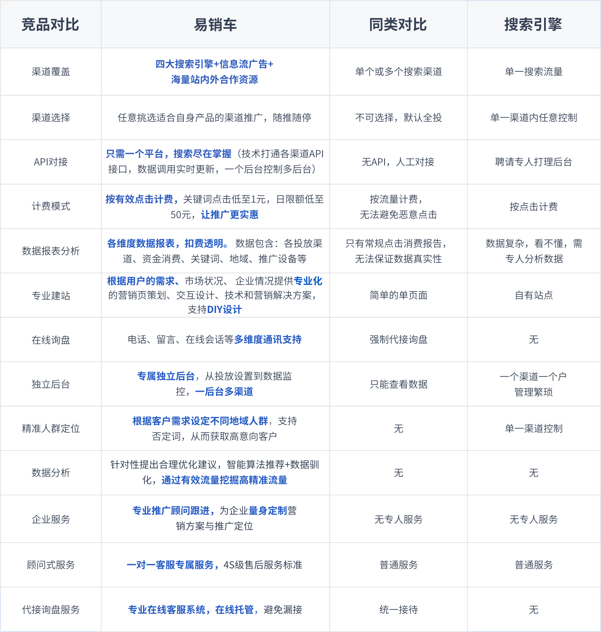 【易銷車】是找商網2019年強勢推出的全網流量精準聚合營銷服務平臺,匯聚百度、爰采購、360、搜狗、神馬等主流搜索引擎流量,有專業(yè)的策劃、運營、客服團隊,從流量運營、效果轉化到商機對接,最大化挖掘潛在用戶,賦能中小企業(yè)全網營銷,為商家打造全方位的流量矩陣,輕松獲得網絡訂單。